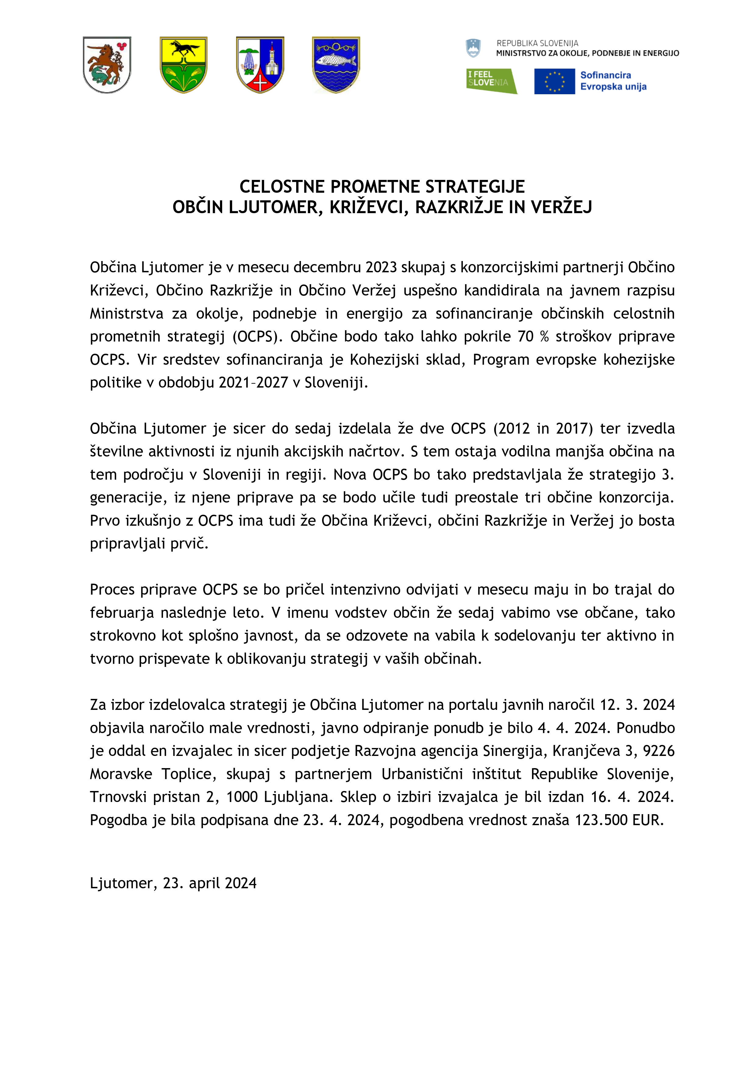 Občina Ljutomer je v mesecu decembru 2023 skupaj s konzorcijskimi partnerji Občino Križevci, Občino Razkrižje in Občino Veržej uspešno kandidirala na javnem razpisu Ministrstva za okolje, podnebje in energijo za sofinanciranje občinskih celostnih prometnih strategij (OCPS). Občine bodo tako lahko pokrile 70 % stroškov priprave OCPS. Vir sredstev sofinanciranja je Kohezijski sklad, Program evropske kohezijske politike v obdobju 2021–2027 v Sloveniji.